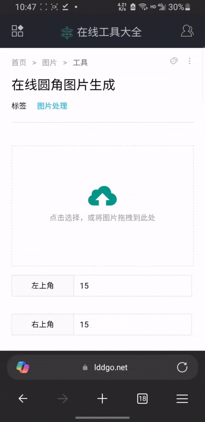 打开 图片圆角处理 网址,选择你的图片,并将值改为 100。
