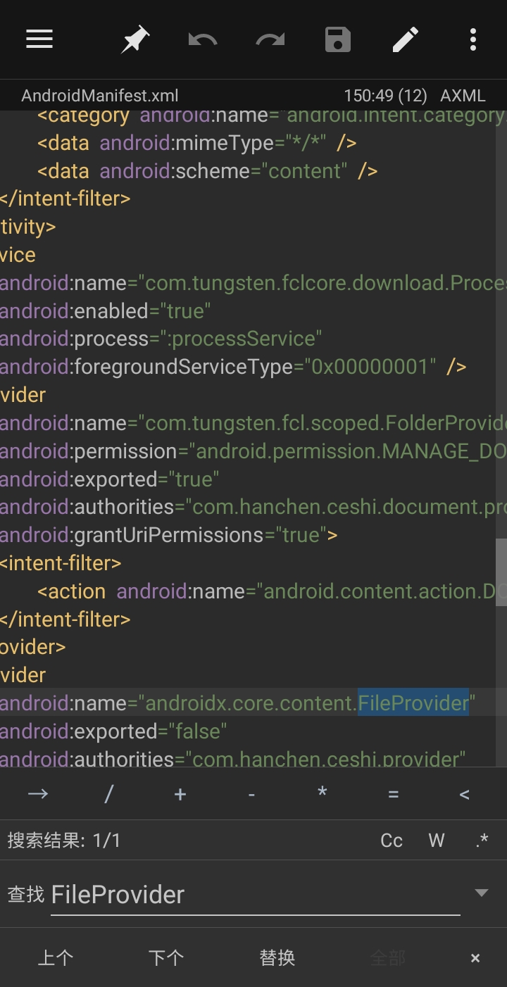 FileProvider,修改android:authorities的值为com.tungsten.fcl.server.provider,然后保存。