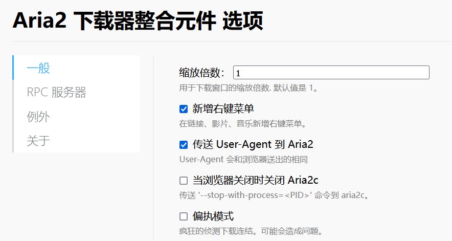 - 在“一般”一栏中,个人建议点选“新增右键菜单”、“传送 User-Agent 到 Aria2”这两个选项,可以提升使用体验。