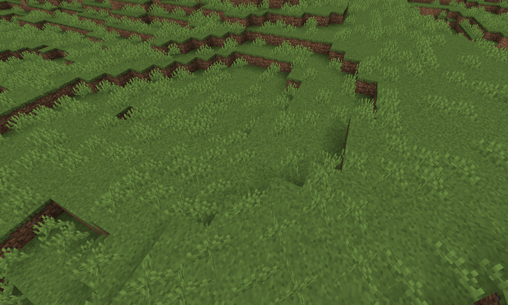 对于每个草方块,我们会将其位置和世界种子置入平面白噪声采样器。这会为每个方块生成一份样本(假设为从 -1 至 1)。之后我们会在采样上应用阈值,从而影响草的分布方式;如果采样的值低于草的生成阈值(在这里我们使用 0),那么草就会生成在这个方块上。