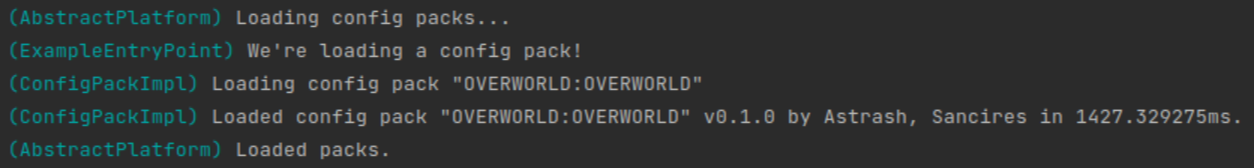 example-addon: "0.1.+" # 我们的示例拓展!(请自行修改你的 ID 和版本)现在,当你再次运行附属时,你应该会在控制台中见到一条载入包时发送的消息: